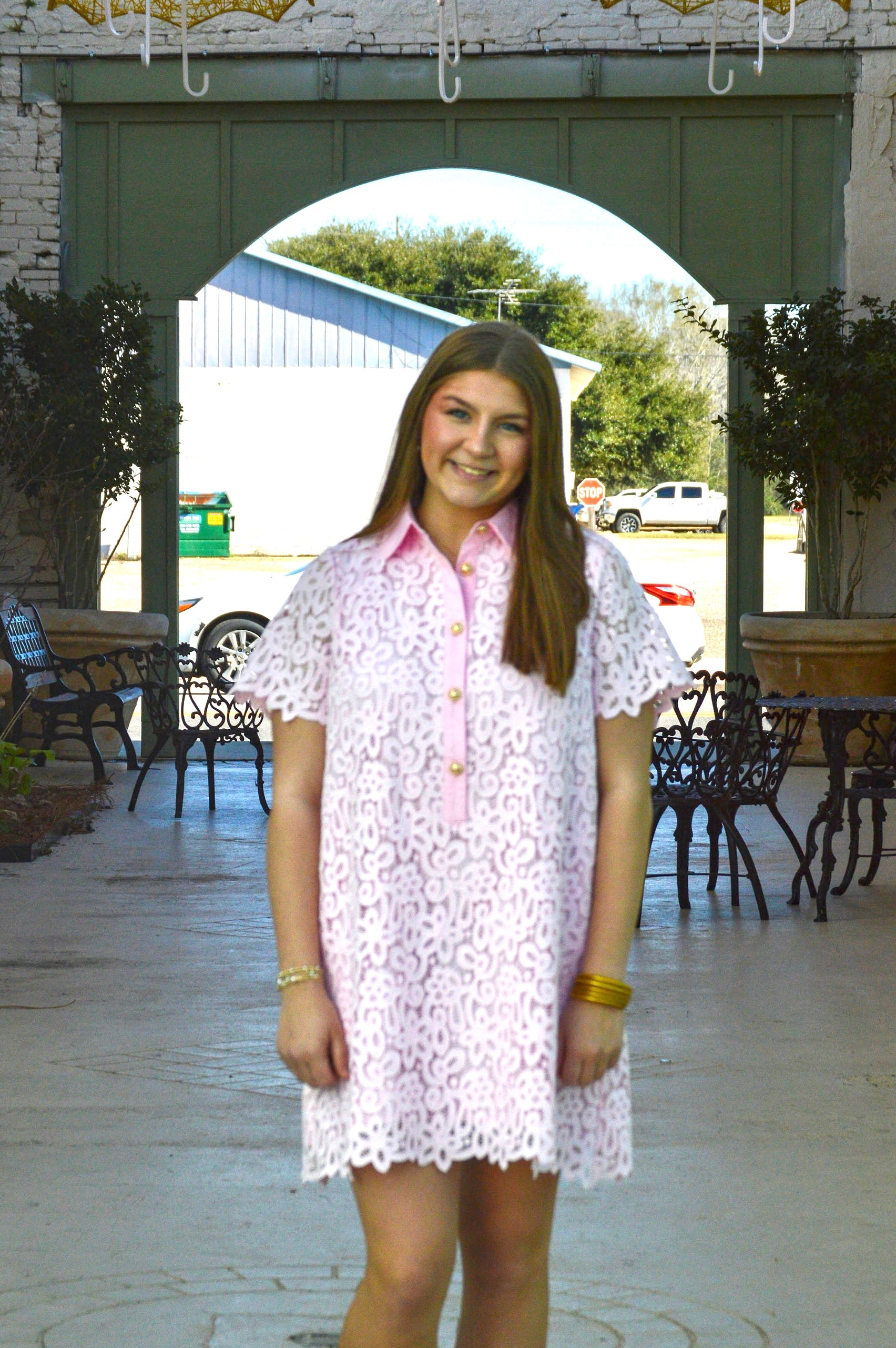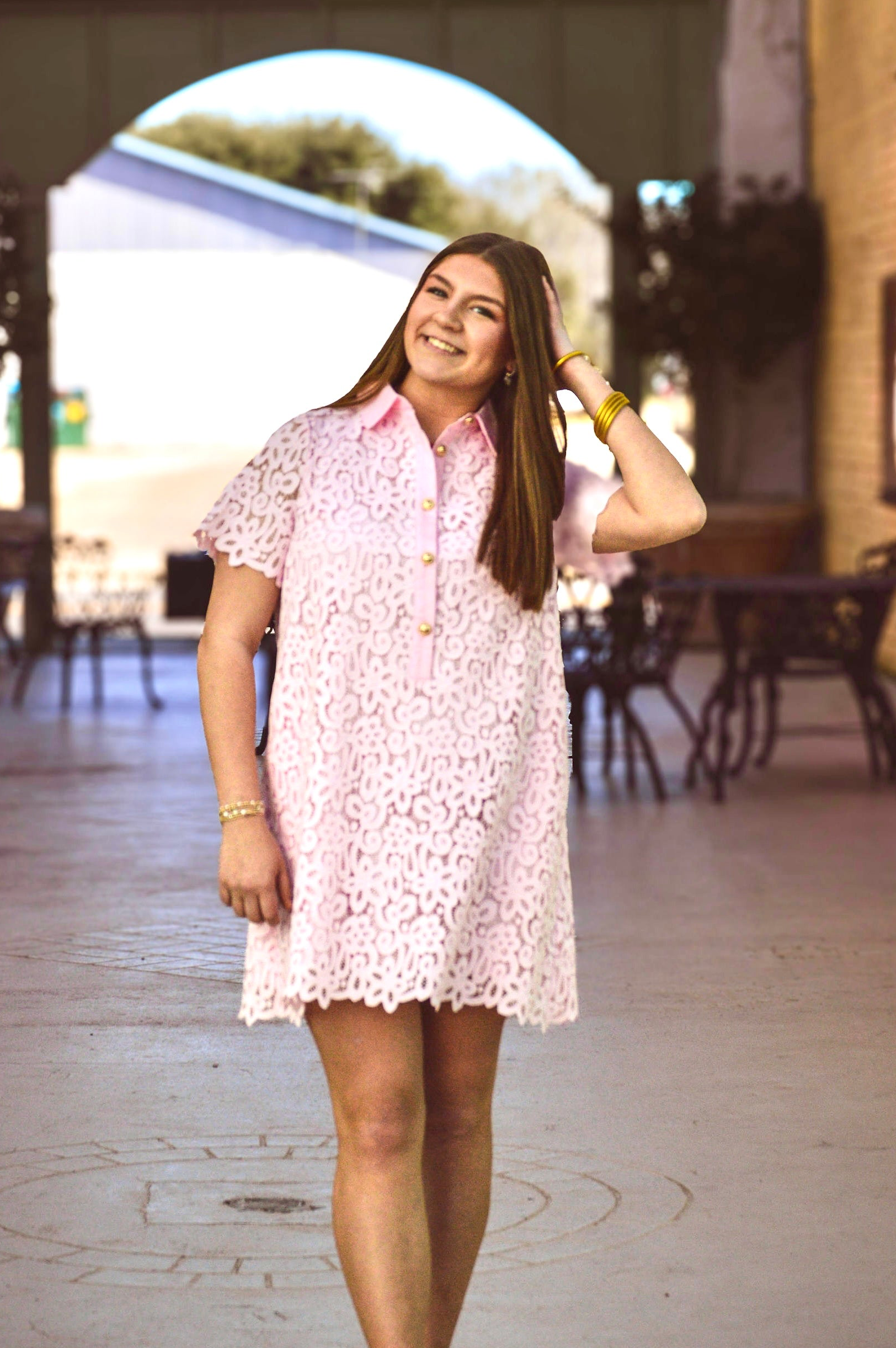 Sweet meat sophisticated in this cute blush lace shirt dress.