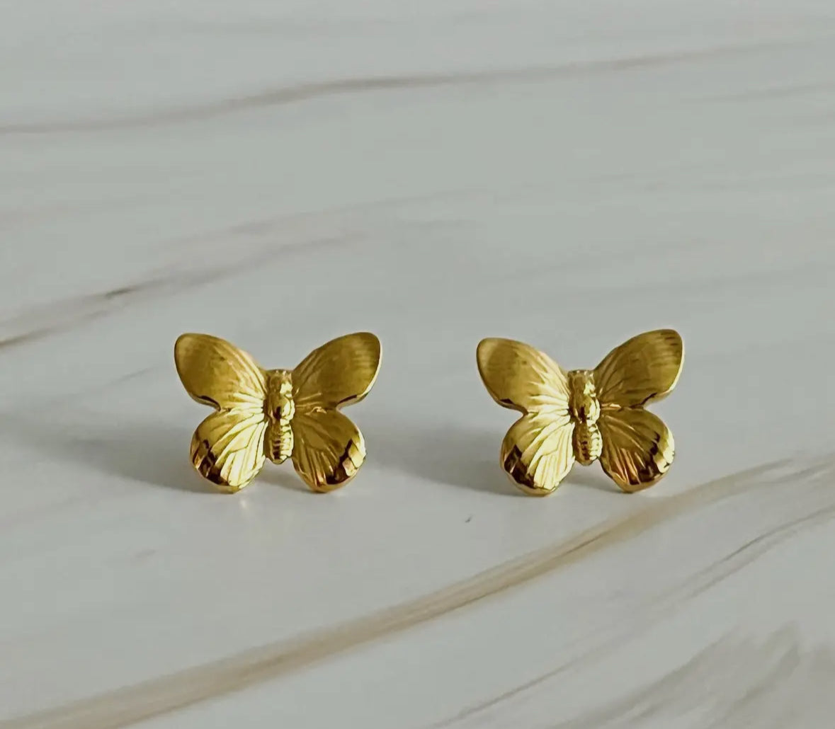 These stunning Vintage Butterfly Stud Earrings feature a beautiful butterfly design that exudes timeless elegance. The classic stud style adds a touch of sophistication to any outfit. Make a statement with these vintage-inspired earrings. Dimensions: approximately 0.5” x 0.8" 18k gold plated stainless steel, tarnish and water resistant Lead and Nickel free Crafted in China